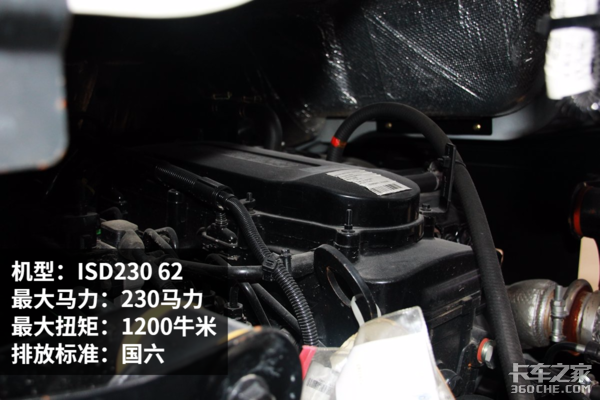 发动机型采用的是康明斯ISDe6.7,排量为6.7升,最大输出230马力,在转速达到1100-1700的时候,可以输出900牛米的最大扭矩。机器除了采用博世的高压共轨系统外,还装配了可变截面涡轮增压器,满足不同工况下发动机的进气量需求。