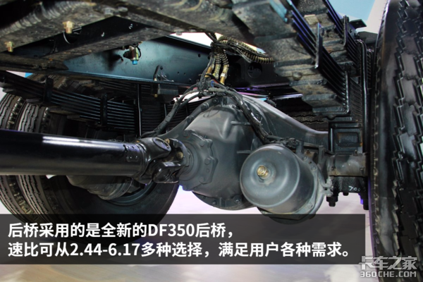 由于该车环卫车底盘,作业时对于速度的要求较低,所以匹配的是东风TD6档手动变速箱以及全新开发的DF350后桥,达到动力性好的同时也更加节油。